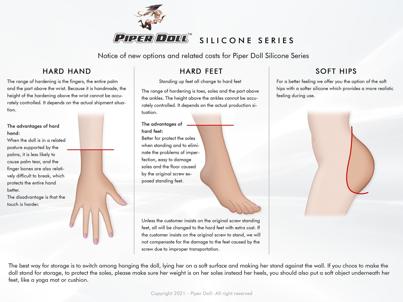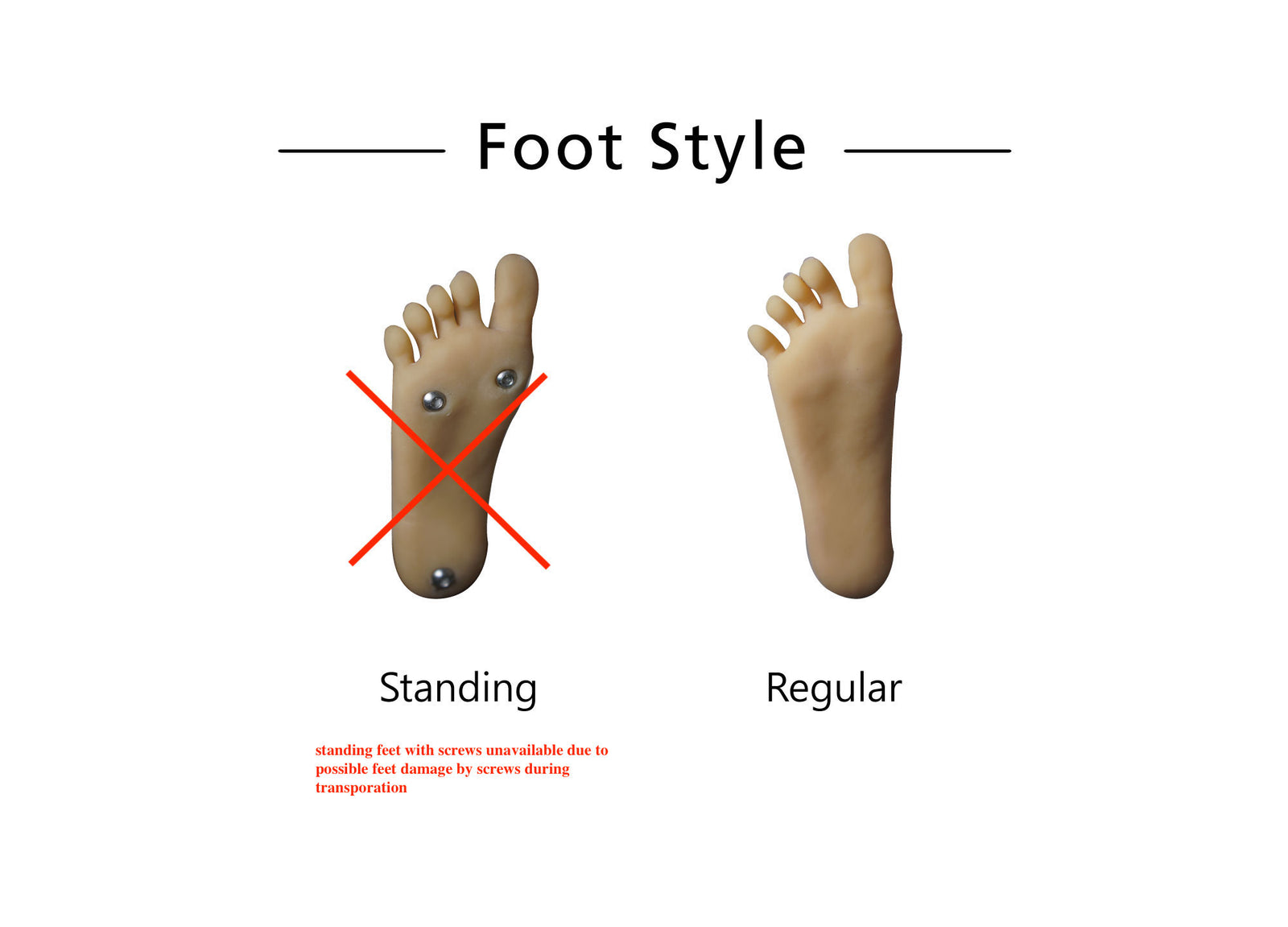 Stående fot. For TPE ser det ut som vanlig, for silikon slik at dukkens fot er litt vanskeligere i stedet, noe som gjør at dukken kan balanseres og stå opp.